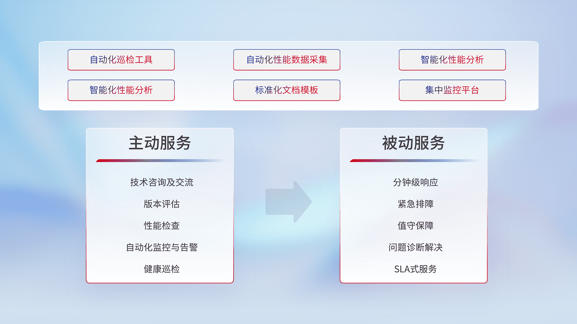 智能化工具和标准化文档,,,保障服务质量,,提供主动服务(包含技术咨询、、版本评估、、性能检查、、、、自动化监控与告警、、、健康巡检)和被动服务包含(分钟级响应、、、、紧急排障、、、、值守保障、、、问题诊断解决、、、SLA服务)。。。。